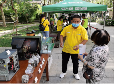 在北再生集团的摊点,居民用废旧电器即可换取兑换券,再凭券换取米面油等生活用品。工作人员还提供免费回收大件垃圾服务、帮助社区清理“僵尸自行车”,赢得了居民点赞~
